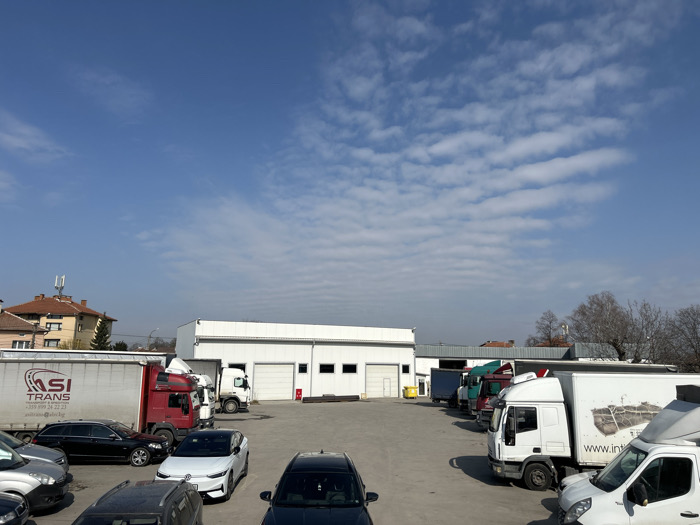 The image depicts an outdoor industrial or commercial parking lot in Krivina, Bulgaria, under a bright, partly cloudy daytime sky