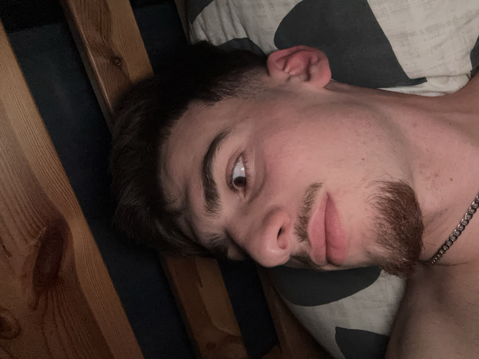 A young man lies in bed, his head resting on a patterned pillow. He has dark hair, light skin, and a trimmed beard. His eyes are open, and he looks directly at the viewer. A wooden bed frame is visible on the left side of the image. He wears a silver chain necklace. The lighting is dim.