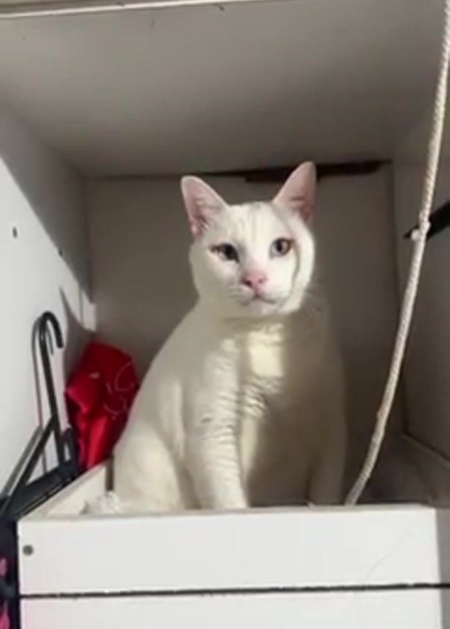 A white cat with heterochromia (one blue eye and one yellow eye) sits in a white wooden box inside a cupboard. Beside the box, there is a red object, some clothes hangers, and a white rope. The cat sits calmly, staring forward.