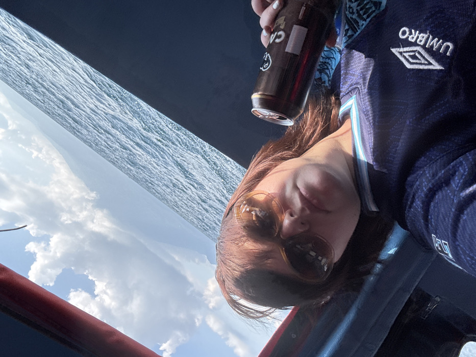 A person with reddish-brown hair, wearing sunglasses and a dark-colored shirt with a white Umbro logo, holds a brown can of beer. The background shows a view from a boat or vehicle. Water and clouds are visible through the windows. The perspective is slightly angled, presenting a unique view of the person and the scenery.