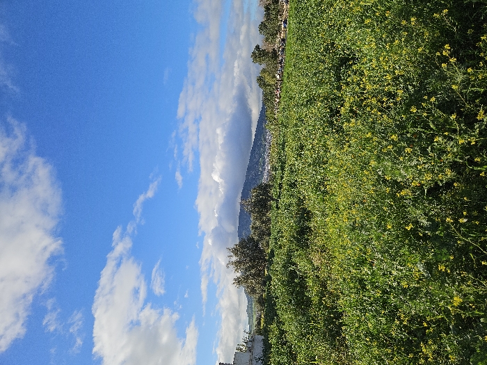 The image displays a wide outdoor landscape under a bright blue sky partially obscured by scattered white cumulus clouds. The foreground is dominated by an extensive field of dense green vegetation interspersed with numerous small yellow flowers. No individuals are visible. In the midground, a line of trees, exhibiting a mix of green and brown foliage, separates the field from a more distant scene. To the far right, a discernible section of a road or parking area contains several parked vehicles. On the far left edge, a fragment of a white building is partially visible. The background reveals a prominent, dark green-hued mountain or large hill, beneath which a sprawling urban settlement, characterized by multiple buildings and structures, is situated. This scene is consistent with the transitional agricultural and urban environments found on the periphery of Fez, Morocco, where agricultural lands directly border the city and its surrounding hills.