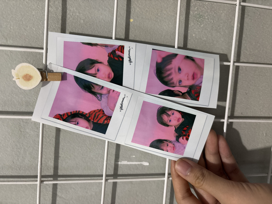 The image displays two vertical instant photo strips, likely photobooth prints, against a light grey, textured wall, partially obscured by a white metal grid panel