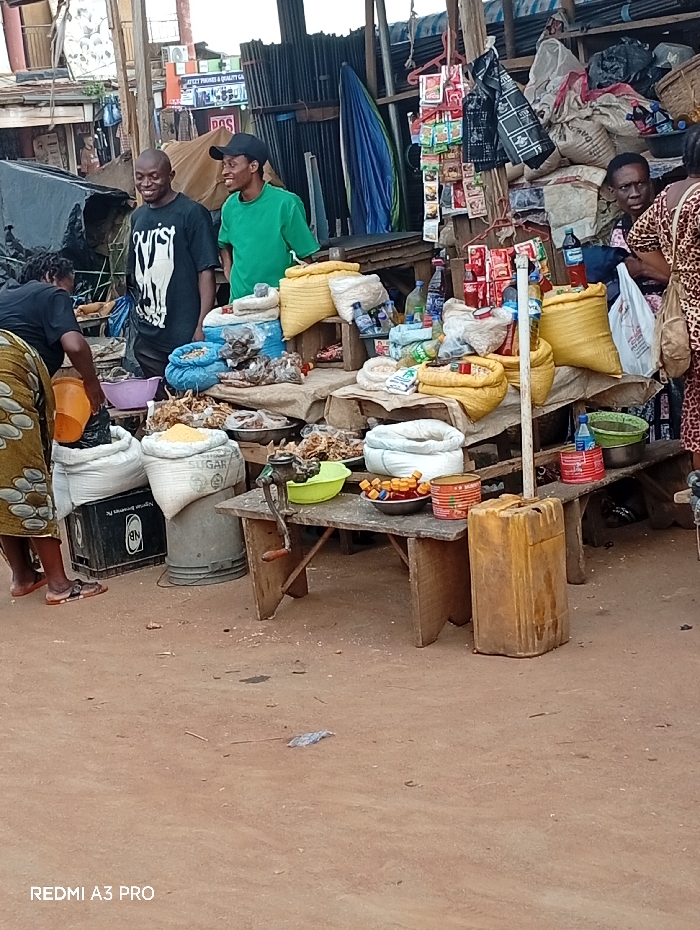 This image depicts an active open-air market stall in Akokwa, Nigeria
