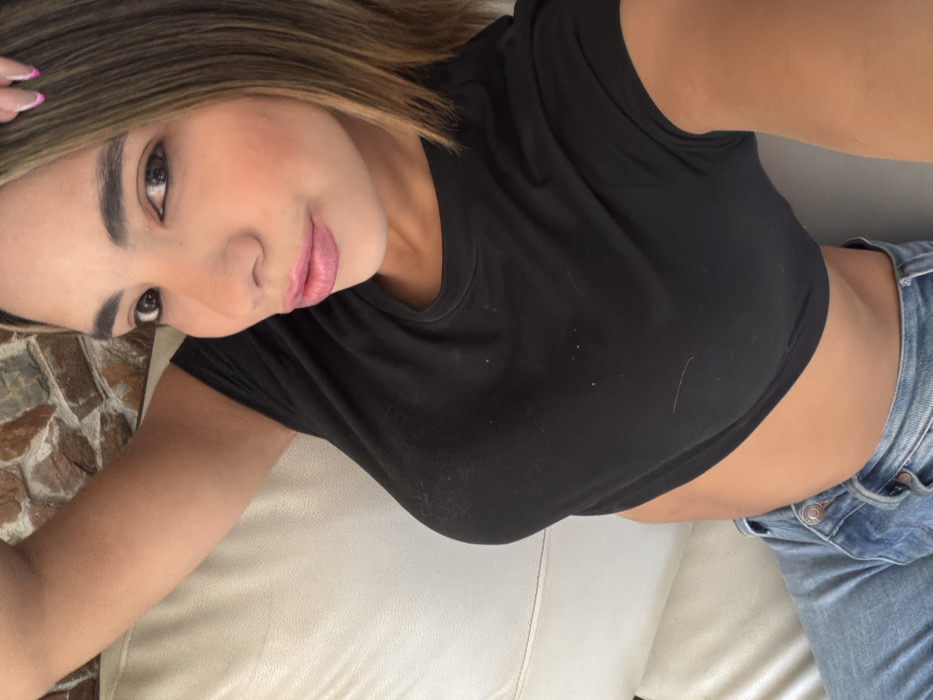 A woman poses for a selfie. She is lying on a white couch, wearing a black crop top and blue jeans. She has light brown hair with blonde highlights and light pink lipstick. A brick wall is visible in the background, adding texture to the scene. The lighting highlights her features, creating a casual yet captivating image.