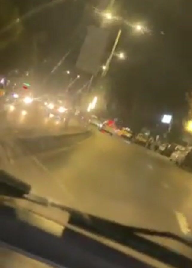 driver's perspective through a windshield at night on a well-lit street. Cars and other vehicles are visible with their headlights on, moving in the same direction as the camera car. Streetlights illuminate the road. Some pedestrians are visible on the side of the road. The windshield wipers are visible at the bottom of the frame. The general scene indicates nighttime driving in an urban setting.