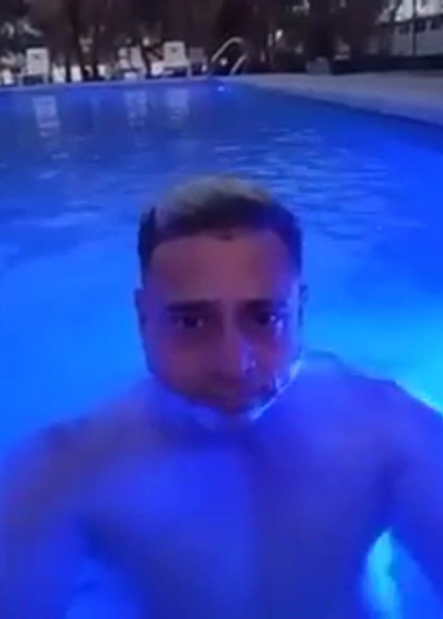The video depicts a man waist-deep in a swimming pool