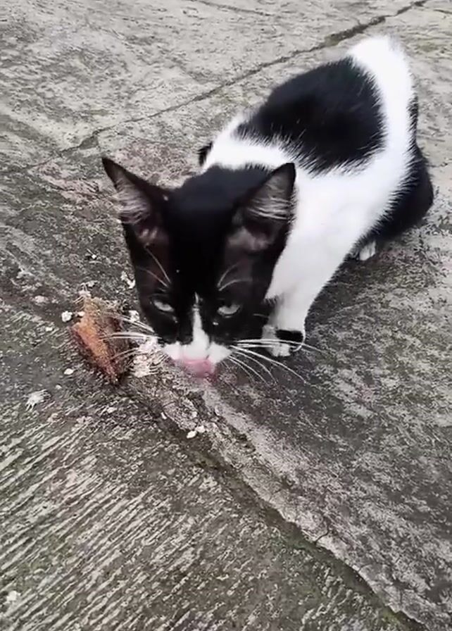 black and white cat eating something off of a concrete surface. The cat is mostly white with black patches on its head and back. It is crouched down and eating from a brown object with some scattered white pieces around it. The concrete surface is gray and has noticeable ridges. There is a faint sound of someone talking in the background.