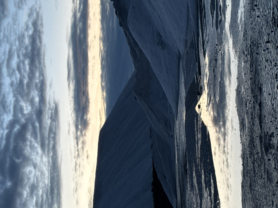 A vertical composition showcases the sharp, blue-gray peaks of mountains silhouetted against a sky transitioning from a soft, pale gold to a deep, cloudy blue. The textures of the mountain surfaces are pronounced, suggesting rough, rocky terrain. The sky features layered cloud formations, adding depth and dynamism to the scene. The image evokes a sense of stark, natural beauty.
