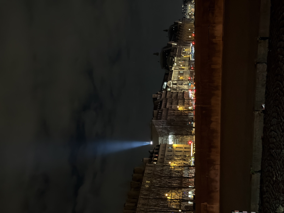 A nighttime cityscape is split vertically, with cloudy darkness on the left and illuminated buildings on the right. A bright beam of light shines upwards from the buildings into the dark sky. A rusty metal barrier runs along the right edge of the frame, partially obscuring the illuminated buildings. The buildings feature architectural details and streetlights, adding depth to the urban scene.