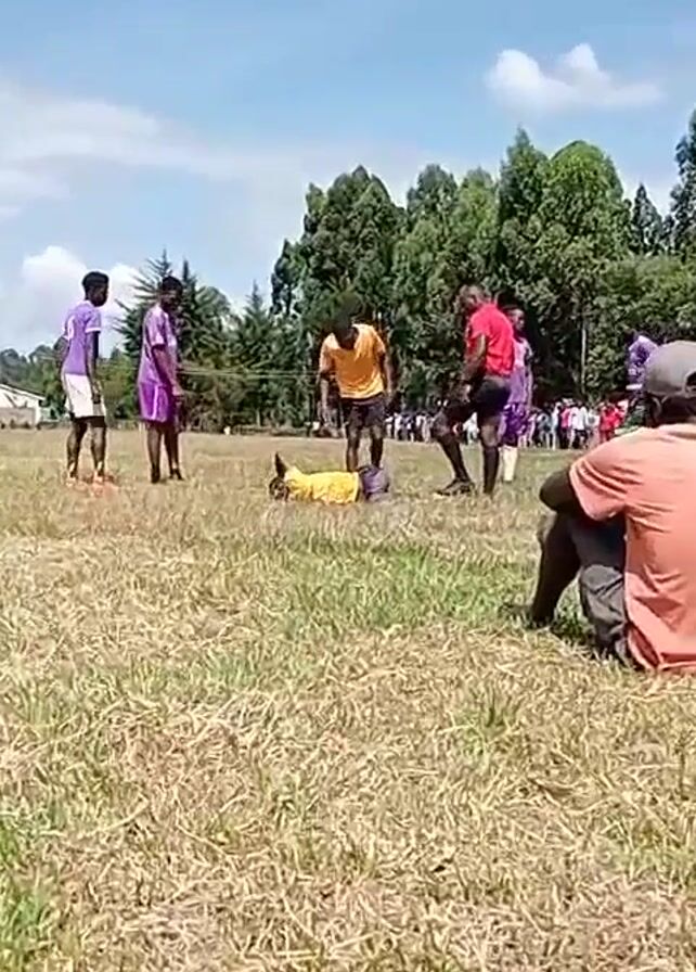 The scene shows a soccer field with dry, grassy turf. A player in a yellow jersey lies on the ground, apparently injured. Another player, wearing a gold jersey, and a referee in a red shirt, are attending to him. Two players in purple jerseys stand nearby. There are other people in the background. A person wearing an orange shirt sits in the foreground to the right, with their back to the camera, watching the situation. Trees and a blue sky with clouds are visible in the background.