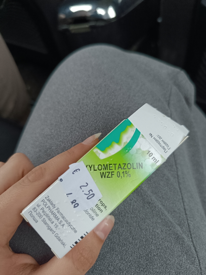 - "An individual's left hand holds an upright, rectangular white and green box of Xylometazolin WZF 0" by FM-SVEiv2, licensed under CC BY 4.0