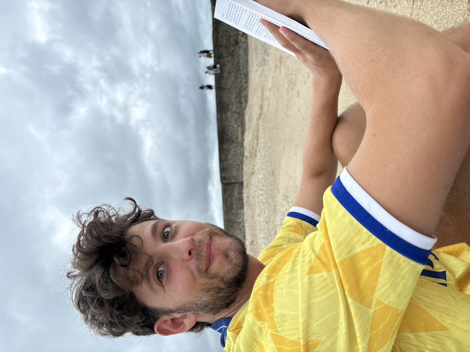 A male subject is seated on a sandy surface in the foreground, looking directly at the camera with a slight smile, on a beach in Hengchun, Taiwan. He has curly brown hair and a short beard, and wears a yellow short-sleeved shirt with a geometric pattern and blue and white striped cuffs. His right hand holds an open book displaying text in a non-Latin script. In the mid-ground, a low concrete wall or barrier traverses the scene. Approximately five to seven indistinct figures are visible standing or walking on top of this wall in the distance. The sky above is entirely overcast with grey clouds.