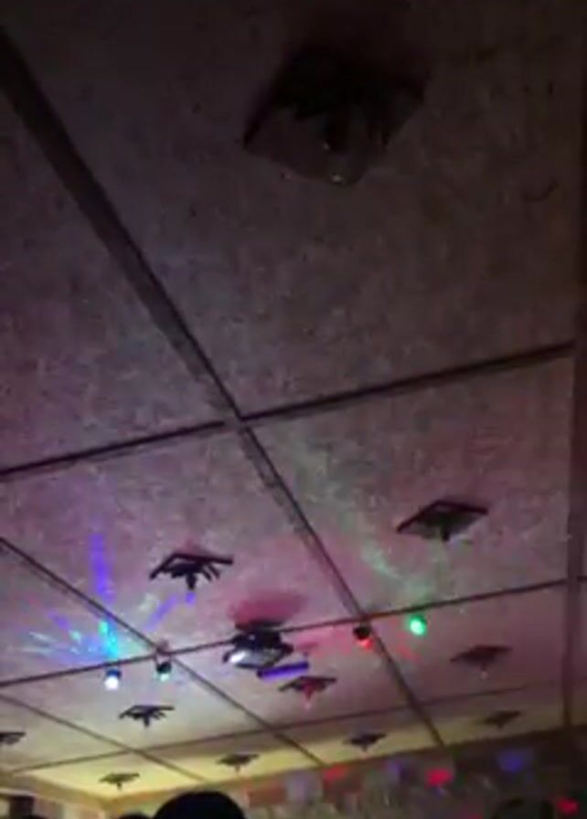 low-angle shot of a ceiling in what appears to be a dimly lit club or party venue. The ceiling is made of rectangular panels with visible seams, possibly plywood. There are several dark, spider-shaped decorations attached to the ceiling. Several lights are mounted on the ceiling, emitting colorful beams of light – red, green, and blue – that move and create a dynamic, festive atmosphere. The foreground shows the silhouettes of people, indicating a crowd is present. There is also some indistinct background noise.