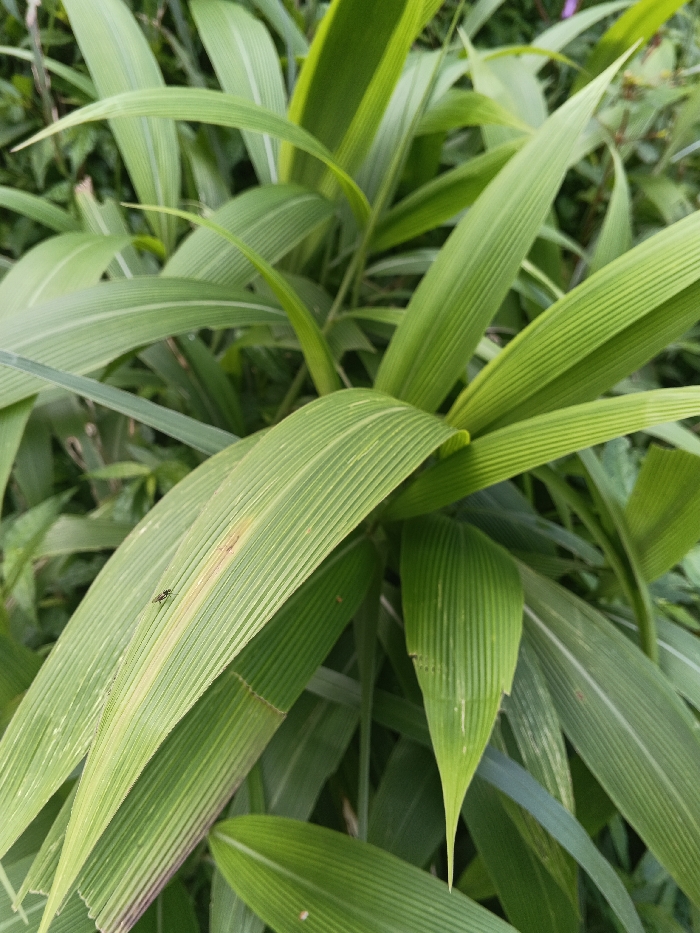 A close-up displays lush green grass with distinct, parallel lines running along the length of each blade. The blades vary slightly in hue, displaying shades of light and dark green. An insect rests on one of the blades, adding a touch of wildlife to the scene. The composition emphasizes the textures and intricate patterns of the grassy foliage, creating a natural and visually appealing image.