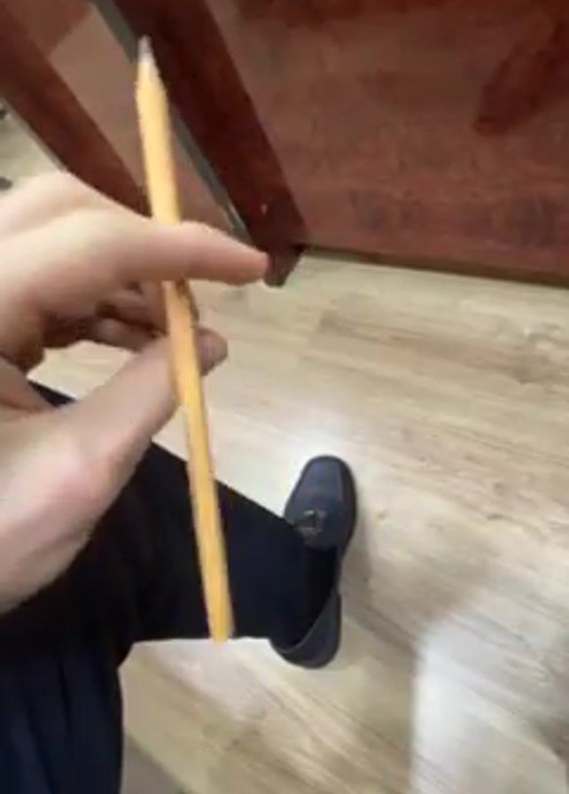 A person wearing navy blue pants and dark blue shoes sits indoors on a light wood floor next to a dark brown table with a shiny surface. The person holds a yellow pencil in their right hand and twists it back and forth.