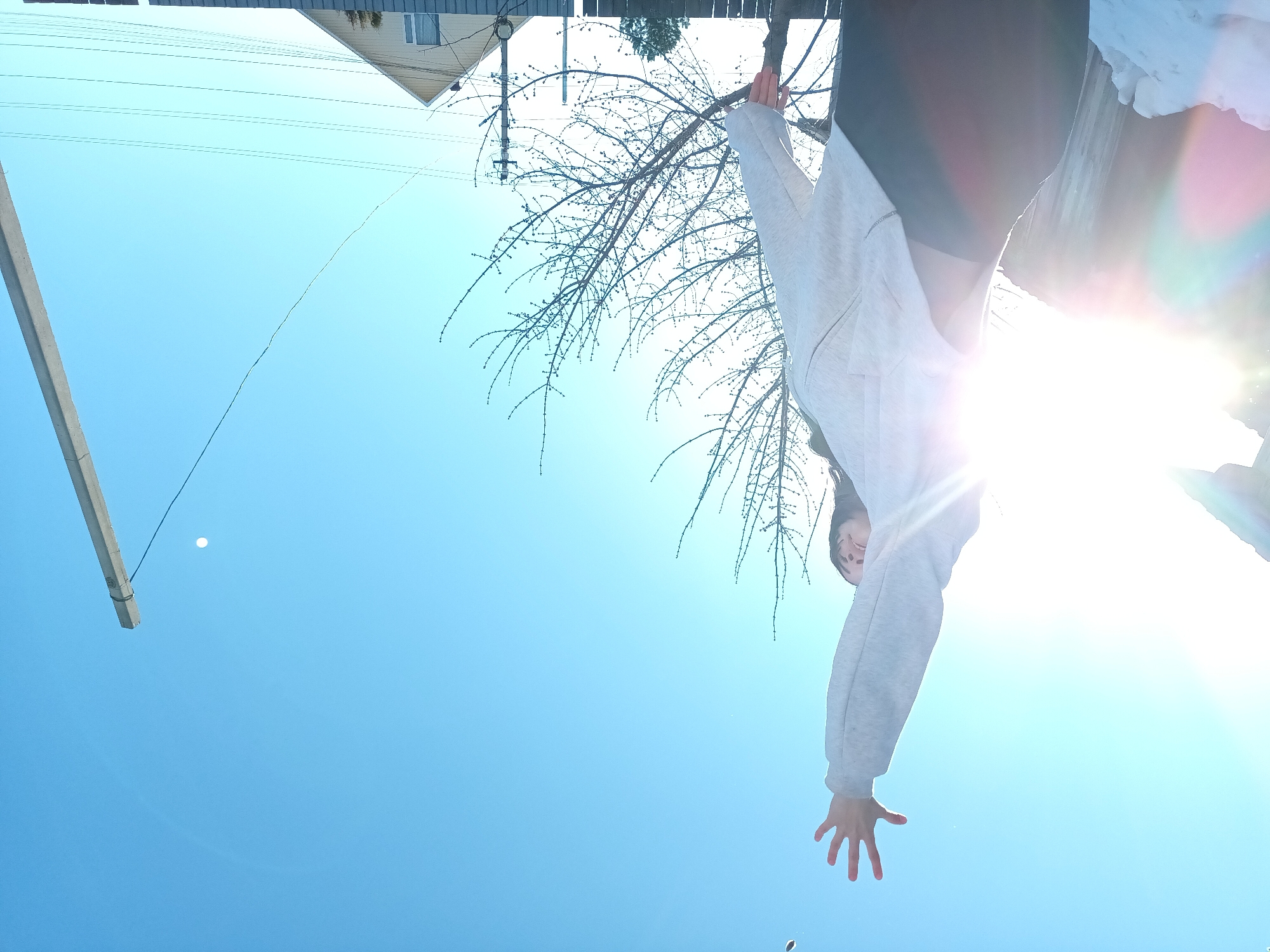 Here's a description of the image: The photograph is taken from a low angle, pointing upwards towards the sky. The sky is a clear, bright blue. A young person is partially visible, wearing a light-colored sweatshirt. They are reaching downwards, towards the camera. Bare tree branches are visible in the background. A telephone pole and wires, along with the edge of a building, are visible in the upper left of the frame. The sun is high in the sky and creates a bright glare in the upper right portion of the image. The location is likely in Ольховка, Russia given the prompt instructions.