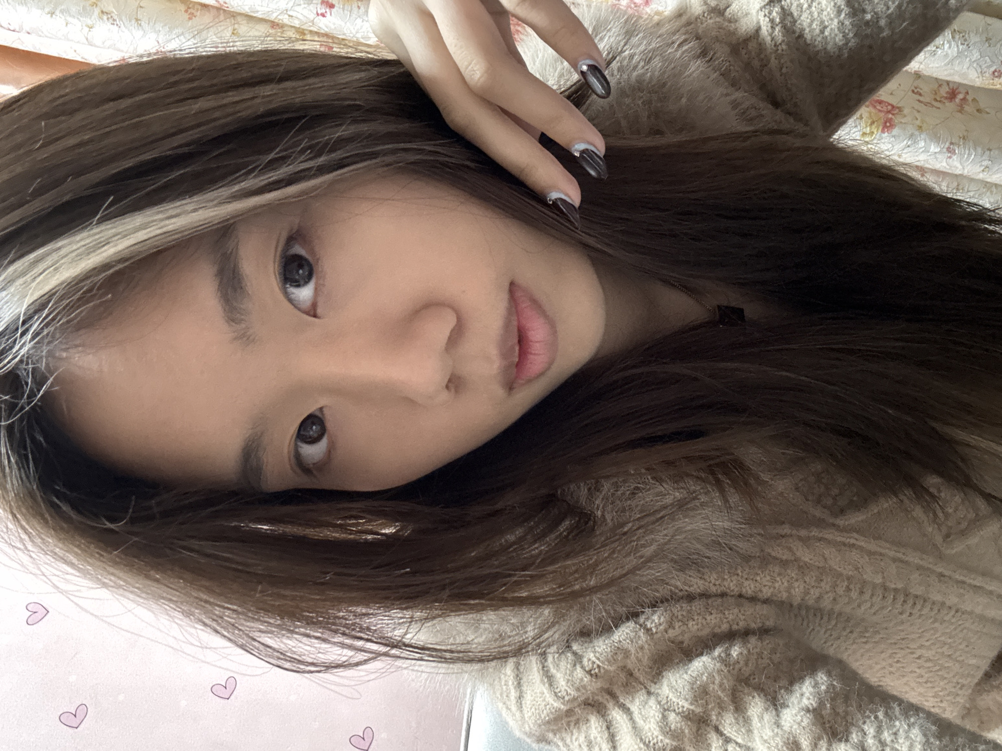A woman with long brown hair with a single blonde streak is positioned in the center of the frame, angled towards the viewer. She has brown eyes and fair skin. Her hand is raised near her face, showcasing dark-colored nails with a silver accent. She is wearing a beige knit sweater. The background includes a floral-patterned curtain and a surface with small pink heart designs. The location and specific activity are not evident from the image.