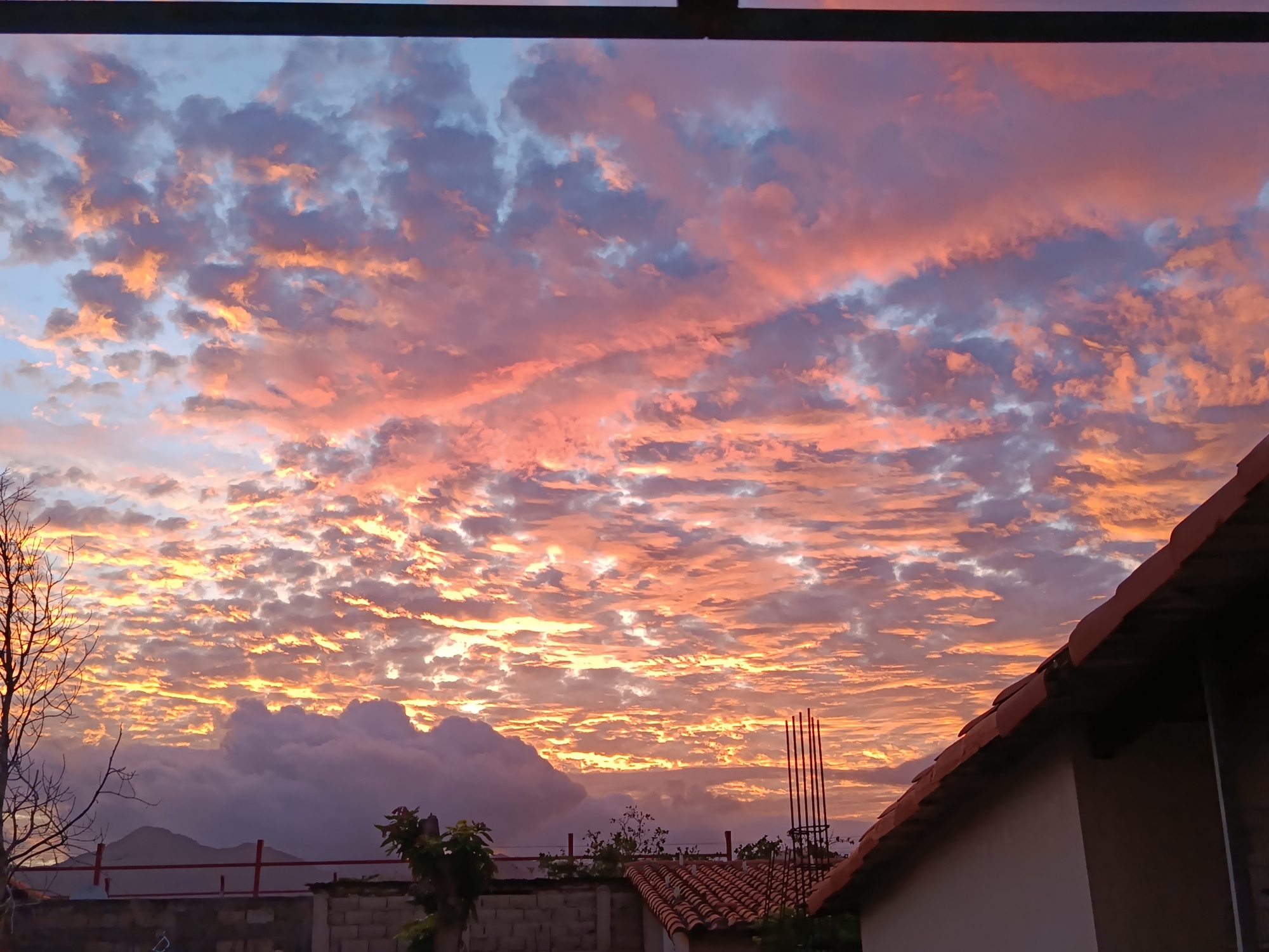 The image presents a vivid sunset sky, characterized by a dense layer of altocumulus clouds, illuminated with orange and pink hues. The sky is visible above residential structures. A building with a red tiled roof is partially visible on the right, and a brick wall is visible in the middle ground. A bare tree is partially visible on the left. Background elements include a mountain range and other buildings, partially obscured by a cloud layer. The location is Altagracia, Venezuela.