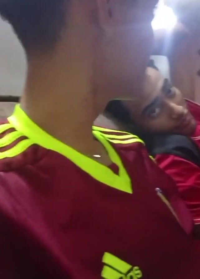 Two young men are in a room, likely a living room. The camera is held by one of the men, who is wearing a maroon Adidas soccer jersey with neon yellow accents. The other man is reclining on a brown couch, wearing a red shirt with a black vest. He is looking directly at the camera. The room has a slightly cluttered appearance, with various items visible in the background, including what appears to be a wall decoration. The lighting in the room is somewhat bright. The camera holder starts speaking.