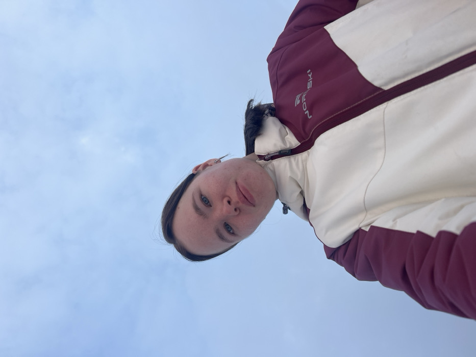 An image taken in Сергино, Russia, captures a low-angle view of a young adult female looking directly into the camera. She has light skin, dark hair pulled back, and blue eyes. A small silver stud earring is visible in her left ear. She is wearing a two-tone winter jacket with a full zipper. The jacket features dark red/maroon sections on the viewer's left shoulder/chest and right side of the torso, contrasted with off-white/cream sections on the viewer's right shoulder/chest and left side of the torso. The brand "NOR SKI" is visible on the maroon section of the jacket on the viewer's left chest. A dark fur trim is visible around the collar/hood area. The background is a pale blue sky with subtle, diffuse white cloud formations. No other environmental features or objects are present.
