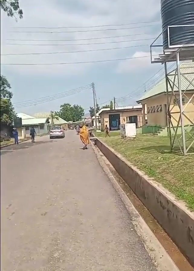 person in a yellow robe walking down a paved road alongside a narrow concrete drainage ditch. To the right, there's a grassy area with a water tank supported by a metal frame and a solar panel street light. Behind the tank, there are low, single-story buildings. One building is painted a light yellow with green trim and a light green roof. There's a white generator on the lawn, and another building behind it. Further down the road, more people can be seen walking near the buildings. A white car drives past. Overhead are power lines against a partly cloudy sky. The focus remains on the person walking down the road and the immediate surroundings.