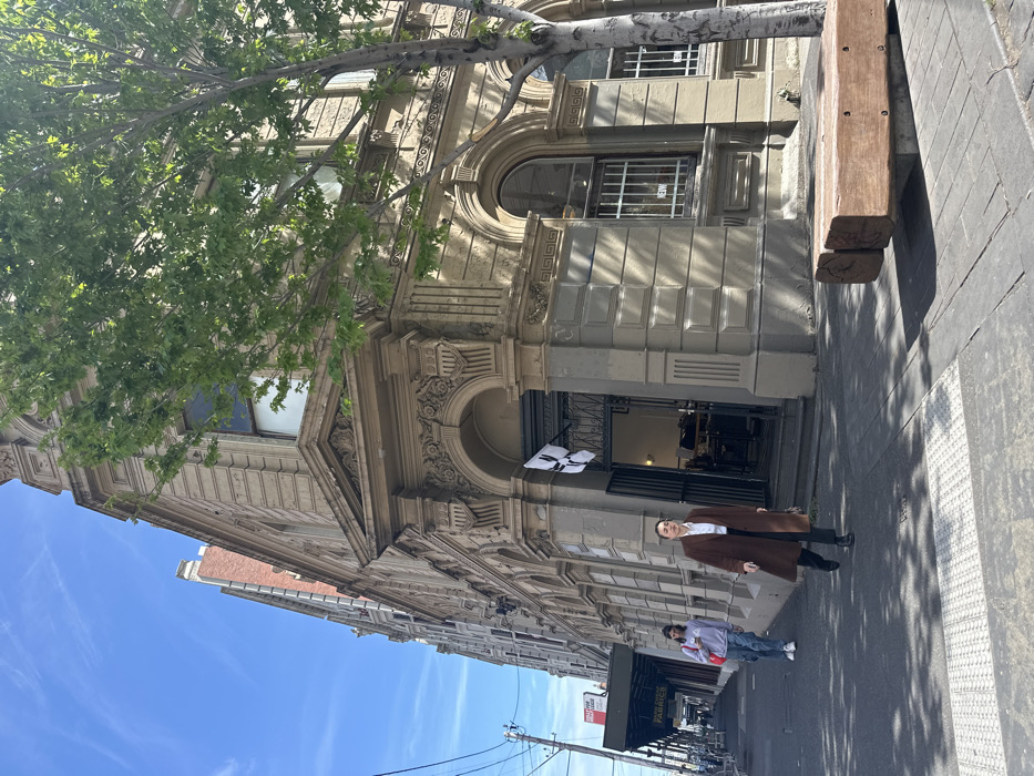 This image captures a daytime street scene on Brunswick Street in Fitzroy, Australia, under a clear blue sky. The prominent subject is a multi-story, light-colored stone building on the right, exhibiting ornate classical architecture. Features include decorative cornices, pilasters, and arched window frames, with vertical metal grates on the ground-floor windows. The building's main arched entrance is open, revealing an interior, and a white flag with a black geometric logo is suspended next to it. A partial sign displaying "NEW!" is visible through one of the ground-floor windows. To the right, a tree with green foliage partially obscures the building, casting shadows on its facade and the sidewalk. On the lower right sidewalk, a rectangular wooden bench, composed of two large timber beams, is mounted on a concrete base. The sidewalk is paved in dark grey, with light-colored tactile paving strips in the foreground. Two individuals are present on the sidewalk. In the mid-ground, a person wearing a long brown coat over a white shirt, dark trousers, and dark shoes walks left to right across the frame. Further down the sidewalk on the left, another person, wearing a light-colored hooded top, blue jeans, and white sneakers, with a red backpack, walks away from the camera. In the background on the left, a row of additional buildings extends down the street. One building features a red brick section at its upper level. A shop awning is visible, bearing a red "SPOTLIGHT" sign and partial text "DRAPE FABRICS." Utility poles and overhead wires are present against the sky.
