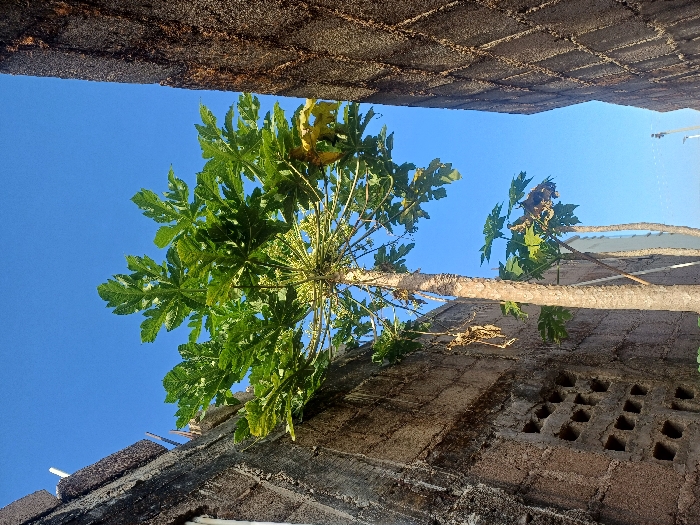 - "A low-angle, upward-looking view captures a mature papaya tree centrally framed between two tall, weathered masonry walls, set against a clear blue sky in Jos, Nigeria" by FM-VxZX52, licensed under CC BY 4.0