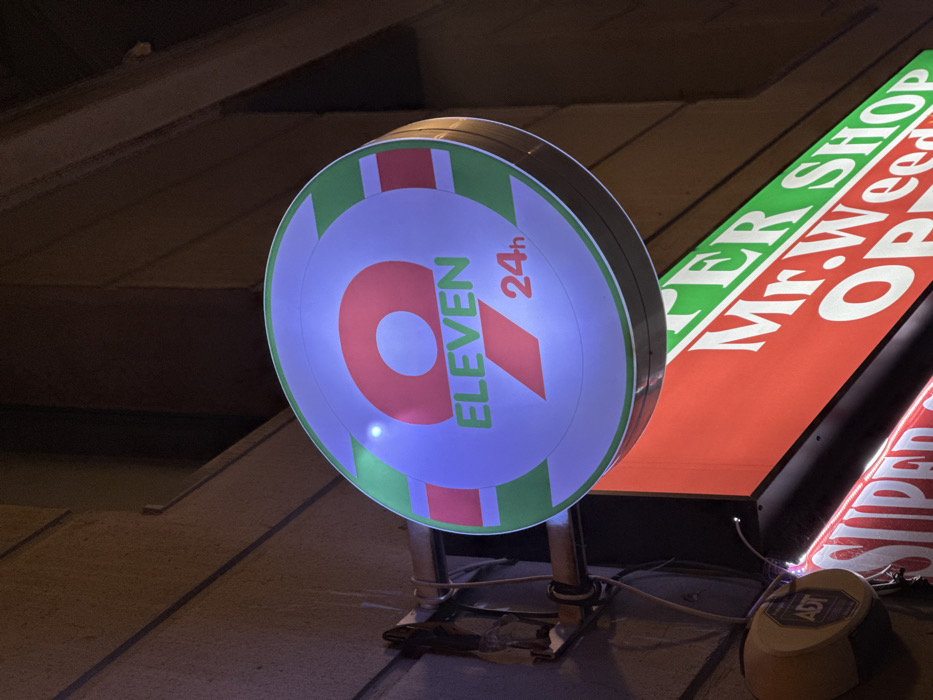- "A bright, round 7-Eleven sign with the logo, "24h," and green accents is mounted on a gray surface" by FM-5V1Jf1, licensed under CC BY 4.0