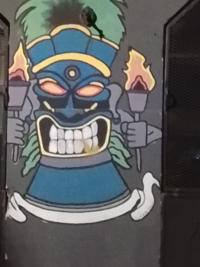 A stylized mural is depicted on a dark grey vertical surface. The central figure is a dark blue, tiki-like face with elongated red-orange eyes and a small circular dot between them. A prominent, wide-open mouth reveals white rectangular teeth, one of which has a yellow-green accretion. The figure wears a blue headdress with a yellow band, topped by spiky green foliage. A dark, irregular stain with a drip is visible on the green foliage. Two grey, stylized arms extend from the figure, each holding an upright torch with orange and yellow flames. Below the face, a blue, trapezoidal shape is visible, with green leafy elements extending from behind the mouth. A white, scroll-like banner with dark outlines is positioned beneath the blue shape. To the immediate right, a dark, vertically oriented structure with a perforated or grid-like surface, resembling a speaker, is partially visible. The scene is located in Unknown, Unknown.