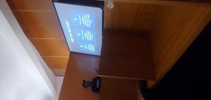 The image depicts an indoor presentation occurring in what appears to be a lecture hall or training room