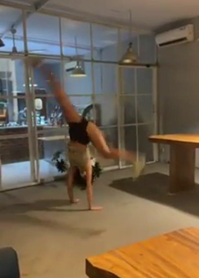 young woman in a beige top and dark shorts performing a cartwheel in a room with a concrete floor. Large windows with white frames are behind her, showing an outdoor area. Two wooden tables are visible in the foreground, and a blue armchair is partially visible in the corner. The room is lit by overhead lights and a ceiling fan. After completing the cartwheel, the woman stands with her hands on her hips and her legs spread.