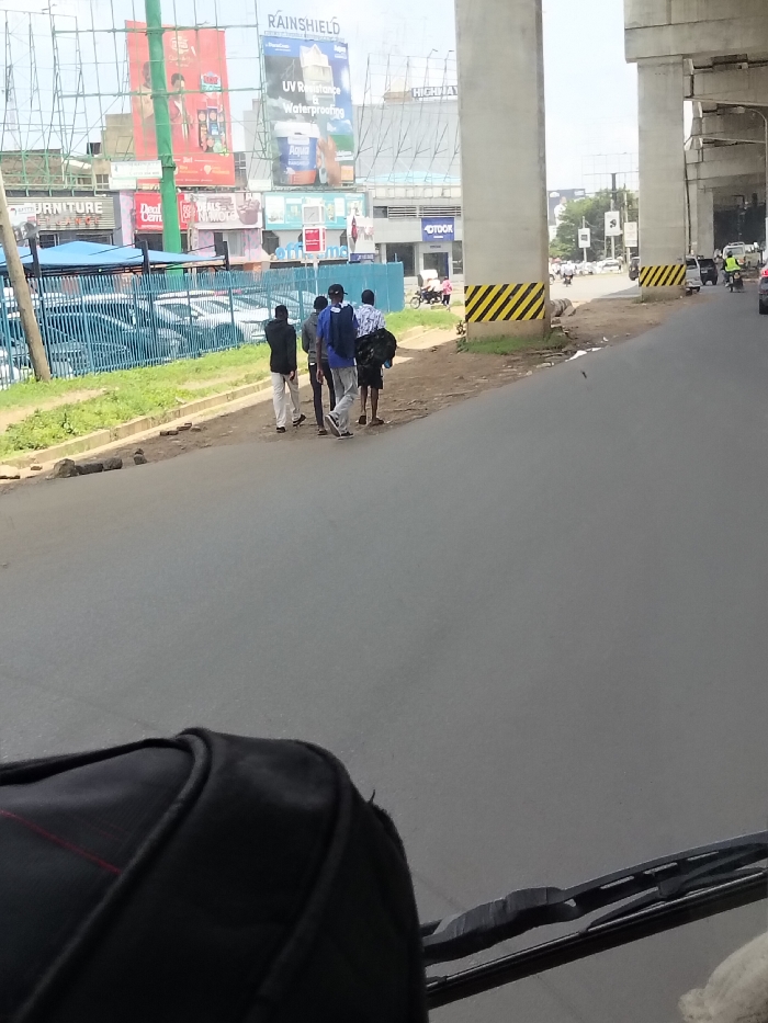 This image depicts an urban street scene in Nairobi, Kenya, specifically along Mombasa Road, beneath the Nairobi Expressway. The photograph is taken from within a vehicle, with a black object and a windshield wiper visible in the lower foreground. In the midground, four young adult males walk eastward on the unpaved shoulder of a paved asphalt road. They are casually dressed; one wears a blue shirt with a backpack and a backward baseball cap, another a grey hoodie, and the individual furthest right carries a black duffel bag over his shoulder. To their immediate left, a concrete curb separates the shoulder from a narrow grassy verge, behind which a blue metal fence encloses a car park containing multiple parked vehicles. On the right side of the road, large grey concrete pillars supporting the elevated Nairobi Expressway are prominently featured. One pillar at the edge of the road exhibits diagonal yellow and black warning stripes at its base. Further down the road, beyond these pillars, vehicular traffic, including motorcycles and cars, is visible. In the background, a row of commercial buildings stands behind the car park. These buildings feature various storefronts, with legible signage for businesses such as "FURNITURE," "Deal & Co.," and "Stook." Large billboards are erected above and in front of these buildings, displaying advertisements, including one for "RAINSHIELD UV Resistance & Waterproofing" featuring blue and white paint cans. The sky is bright and appears hazy or overcast.