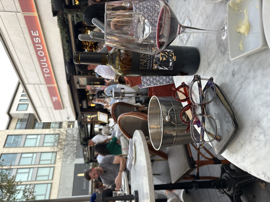Outdoor dining area with tables, chairs, and people. A bottle of Faust Napa Valley Cabernet Sauvignon wine is on a marble table, alongside a glass of red wine and a dish of butter. Two pairs of eyeglasses and a glasses case are also visible. The restaurant "Toulouse" is seen in the background, on a building with surrounding cityscape.