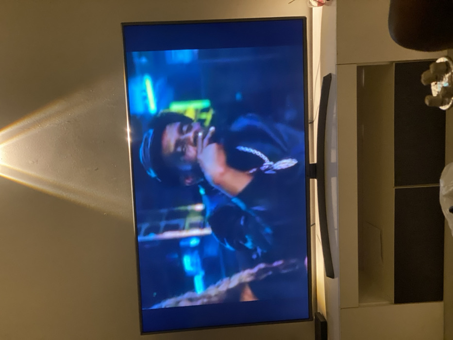 A man with headphones and a chain is displayed on a television screen. The screen has a dark blue hue. He is holding something up to his mouth. In the background, there are blurred blues and greens. A light beam is visible on the wall to the left of the TV. To the right of the TV is a cabinet with dark and light panels.