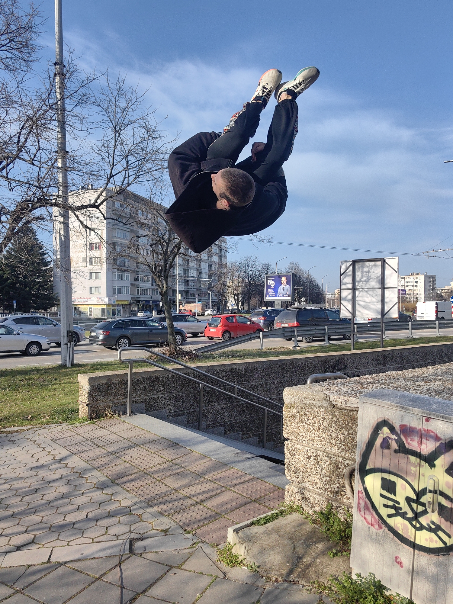 An outdoor, daytime scene in Varna, Bulgaria, shows a male individual in mid-air, inverted, performing an acrobatic flip. The subject is wearing dark tracksuit pants with colorful patterns on the sides, a dark jacket, and athletic shoes with light soles and blue/pink accents. Their head is oriented downwards, and their feet are extended upwards against a clear blue sky with minimal cirrus clouds. The foreground features a paved sidewalk composed of hexagonal and rectangular pavers, leading to a concrete structure with an exposed aggregate finish. Adjacent to this structure is a grey utility box adorned with yellow and black graffiti depicting a stylized cat-like face. A metal handrail indicates stairs descending out of frame to the lower left. Sparse green vegetation grows around the concrete elements. The midground displays a multi-lane road with several vehicles, including a silver sedan, a dark grey station wagon, a red hatchback, a black SUV, and a white van, suggesting active traffic. A grassy median separates the road lanes. Bare deciduous trees and a tall metal pole are visible along the street. The background consists of multi-story residential buildings, characterized by balconies and a muted facade, typical of post-socialist architecture. A large billboard on the right side of the road advertises "7% СМЯНА В СЪРЦЕТО ВАРНА" (7% Change in the Heart Varna), explicitly identifying the city as Varna. Another billboard is partially visible further down the street. Overhead wires, possibly for public transport, traverse the scene. The entire environment is illuminated by direct sunlight, casting distinct shadows.