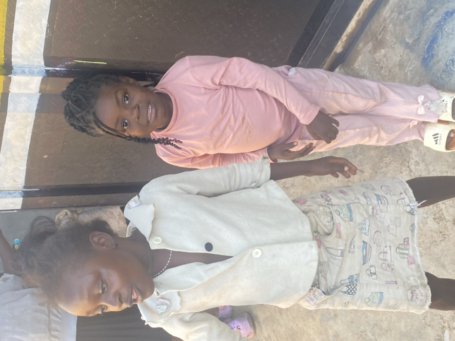 Two young girls stand outdoors on a concrete surface in Udu, Nigeria, illuminated by natural light