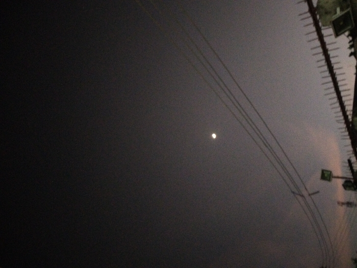 At dusk, a barely visible full moon shines amidst electrical lines and a partially visible antenna tower. The sky is a gradient of dark gray on the left, gradually lightening to a pale, dusky gray on the right. Several street signs are faintly visible on the right, and the lower right corner suggests some foliage. The overall impression is a night scene in a suburban or rural area.