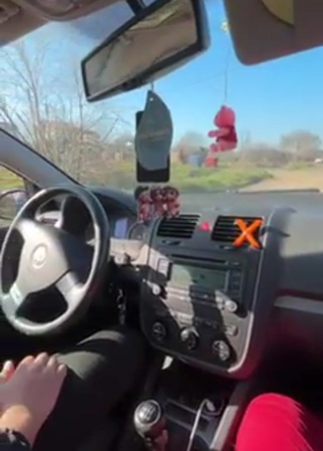 From the interior of a car driving down a country road on a sunny day, a person wearing a black top and red pants manipulates the car radio while loud music plays. The car's dashboard is visible, adorned with an air freshener, a small toy, and an orange X-shaped object. The car has a manual transmission. Beyond the windshield, the landscape consists of a dirt road, green fields, and bare trees under a clear blue sky.