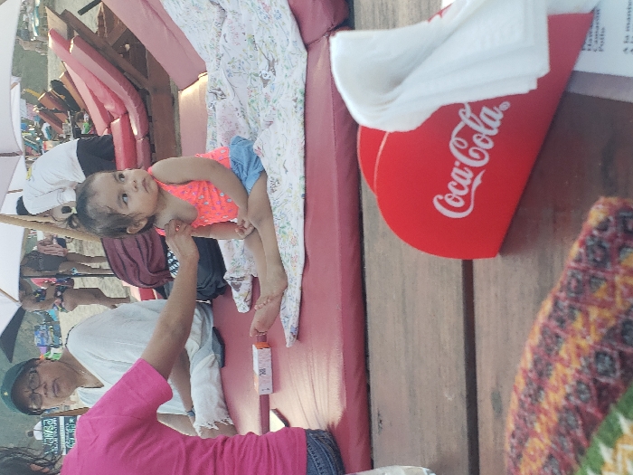 A young child in an orange swimsuit and blue shorts sits on a patterned blanket atop a red cushion. An adult in a pink shirt applies something to the child's skin. Another adult wearing glasses and a white shirt sits nearby. A Coca-Cola branded napkin holder sits on a wooden table, alongside a bottle of lotion. Beachgoers and umbrellas are visible in the background, indicating a beach scene.