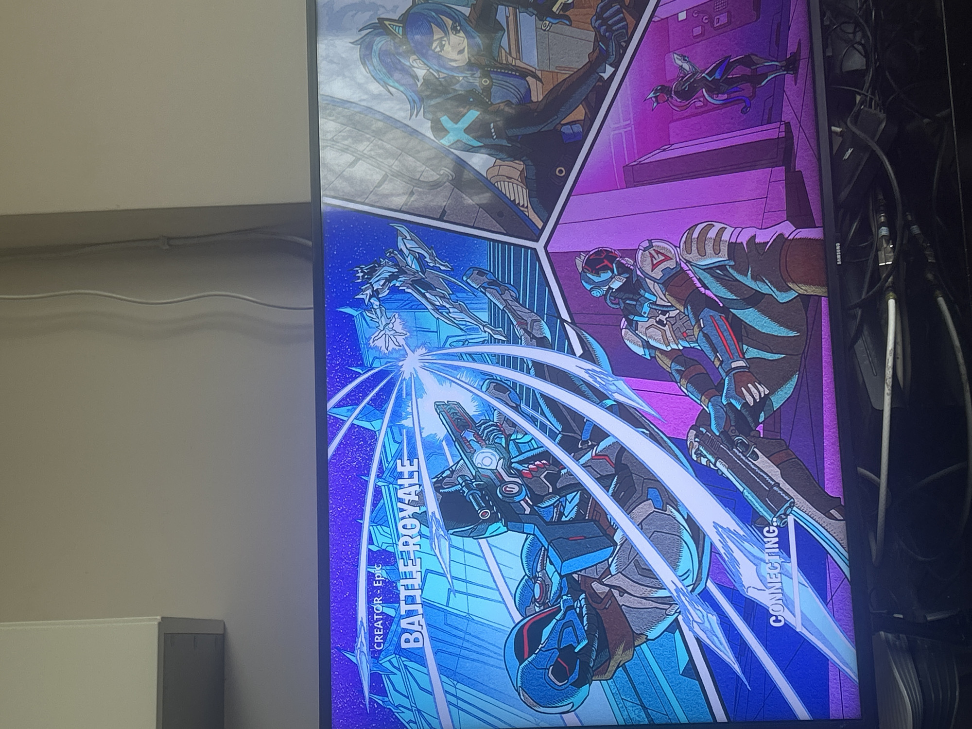 monitor displaying the loading screen for the video game Fortnite: Battle Royale. The artwork depicts several characters in a comic book style, including an anime-style female character with blue hair, a sleek robot-like character, and another humanoid figure in futuristic armor. Below the artwork, the words "BATTLE ROYALE" and "CONNECTING" are visible. The monitor is positioned against a white wall. No information can indicate that this image was taken in Voluyak, Bulgaria.