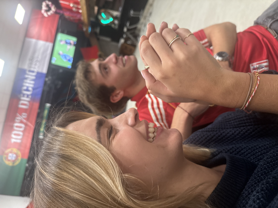 This image depicts an indoor scene with two young adults in Décines-Charpieu, France. The location is identified by a banner in the background displaying "100% DECINES" overlaid on a combination of the Portuguese and French flags. In the foreground, a light-skinned female with shoulder-length blonde hair is shown in profile, facing right. She is smiling broadly, revealing upper and lower teeth, and her eyes are crinkled. She wears a dark blue knitted sweater. Her hands are clasped together; her right hand shows a gold ring on her ring finger and another thin ring on her middle finger. Her left wrist features multiple bracelets, including a brown band, a red and white braided cord, and a thin gold chain. Behind her and to the right, a light-skinned male with short brown hair is also visible in profile, facing right and looking in the same direction as the female. He wears a red polo shirt with white horizontal stripes. His right arm is partially visible, appearing to rest near the female. He wears a silver-colored wristwatch on his left wrist and a thin red string bracelet on his right wrist. The background includes a flat-screen television displaying a blurred image of what appears to be a soccer match with two players. To the right of the television, red decorative items, including a heart-shaped ornament, are visible. A blurred green light fixture is also present further right. The floor is light-colored. Both individuals appear to be focused on an activity or view to their right or on the television.
