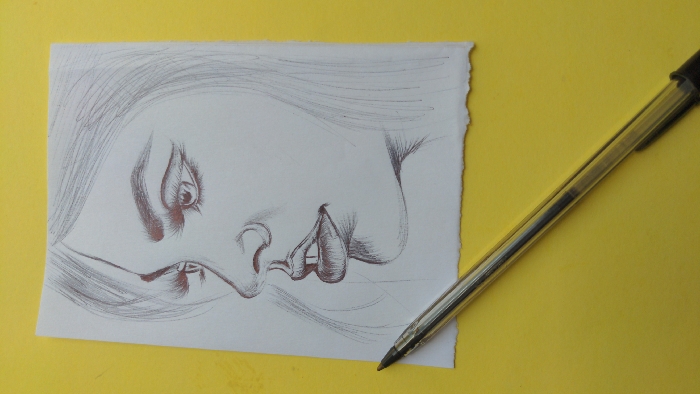 - "An overhead static shot displays a hand-drawn portrait of a woman's right facial profile on a rectangular piece of white paper, resting on a solid yellow surface at an unspecified indoor location in Longuo 'A', Tanzania" by FM-QrecA3, licensed under CC BY 4.0