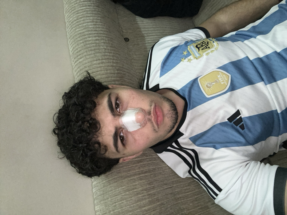 A person with curly hair and a bandage on their nose lies on a beige couch. They are wearing an Argentina soccer jersey with blue and white stripes and the Adidas logo. The jersey also features the AFA crest with stars and a FIFA World Cup 2022 patch. The person has brown eyes and a slight beard. The background is a simple couch texture.