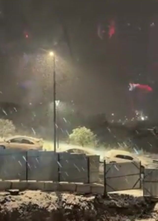 heavy snowstorm at night, with a streetlamp illuminating the snowfall. Cars are parked nearby, covered in snow. A fence is visible in the foreground, also covered in snow. There appears to be a building in the background, with an image of a person visible on a screen or wall. Music is audible.