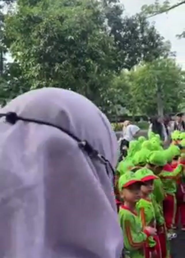 A group of children wearing matching green and red outfits are gathered outdoors, apparently with their teachers and other adults. The children are wearing green caps and long-sleeved shirts with red accents and an embroidered logo, and some are hugging each other. The adults accompanying them appear to be primarily female, with several wearing hijabs. They are standing among trees in an outdoor area.