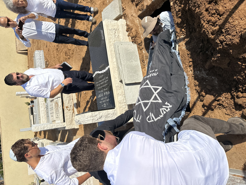 This image depicts a burial ceremony occurring outdoors in a cemetery in Raanana, Israel, under clear, sunny conditions
