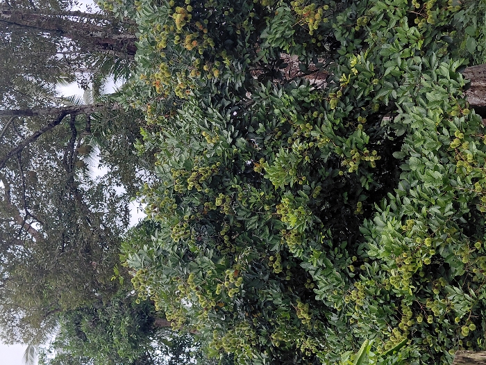 Lush green rambutan trees heavily laden with unripe green fruit fill the frame