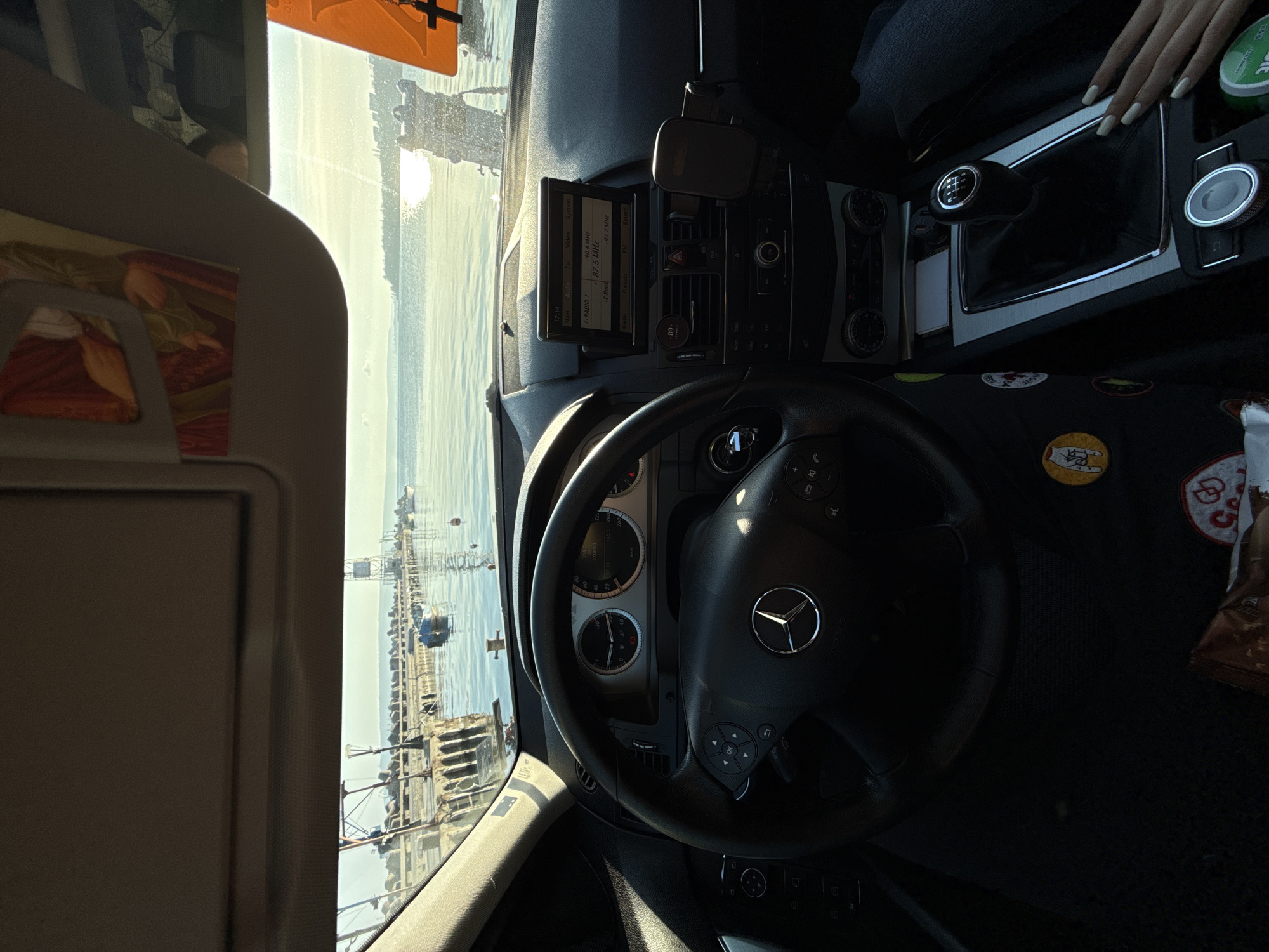 The image depicts the interior of a Mercedes-Benz C-Class (W204 generation) vehicle, viewed from the driver's perspective, overlooking the Black Sea at the Port of Varna, Bulgaria. Inside the vehicle, a black leather Mercedes-Benz steering wheel with integrated controls is prominent in the foreground. The dashboard features an infotainment screen displaying "17:14" and radio frequencies, specifically "Radio 1 - 90.6 MHz", "Z-Rock - 87.5 MHz", and "91.7 MHz". A manual 6-speed gear shift lever is visible to the right of the driver's seat. A right hand, characterized by long, light-colored manicured fingernails, rests near the gear shift. The driver's seat upholstery features multiple embroidered patches or stickers, including a yellow circular one with a cartoon character. The passenger sun visor has an orange rectangular object with a black cross hanging from it, while the driver's sun visor displays decorative artwork. A brown snack bag and other items are on the floor near the driver's seat. A phone mount is affixed to the dashboard. The exterior scene, visible through the windshield, shows a calm body of water, likely the Black Sea. A long concrete pier extends into the water on the left, adorned with bollards and supporting structures, terminating in a prominent lighthouse-like tower. Several small boats are moored near the pier. The low sun is reflecting brightly off the water, indicating late afternoon. A distant coastline or cityscape is discernible on the horizon across the bay. The architectural features of the pier and lighthouse, combined with the presence of Bulgarian radio stations on the car's display, pinpoint the location to the Varna Port area, looking towards the Varna Lighthouse.