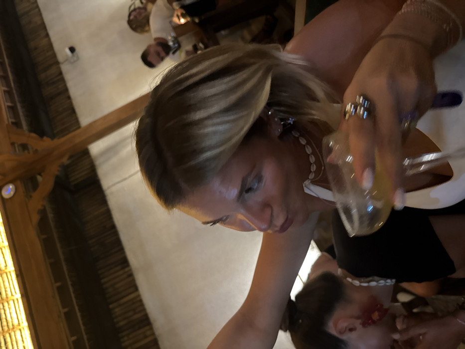 The image depicts an indoor social gathering, likely a bar or restaurant, located in Uluwatu, Indonesia. In the immediate foreground, a blonde woman with fair skin is central, holding a stemmed glass containing a yellowish beverage in her left hand. She wears a white top, a cowrie shell choker, and multiple rings on her left index finger. Her lips are pursed, and her gaze is directed slightly upwards and to the left. To her left, partially visible, is another woman with dark hair pulled back, wearing a black top and a similar cowrie shell necklace, along with a large reddish earring. In the blurred background, to the right, a bearded man in a white t-shirt stands, looking left, with another individual partially visible behind him, seemingly smiling or laughing. The establishment features exposed wooden beams, a ceiling with woven paneling, and light-colored walls. A security camera is visible on the upper right wall. The overall lighting suggests an evening setting.