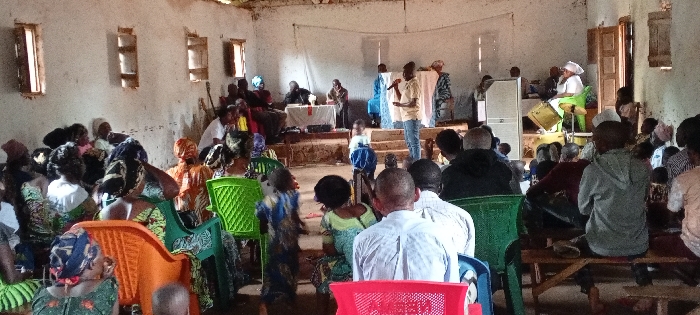 The image depicts an indoor gathering within a large, rustic room in Konongo, Democratic Republic of the Congo